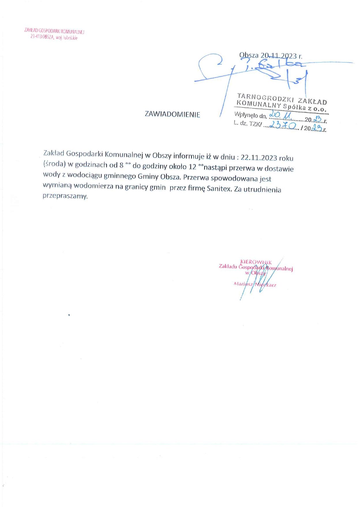 Przerwa w dostawie wody 2023-11-20 22.11.2023 r. (środa) w godzinach 8.00 - 12.00 wystąpi przerwa w dostawie wody, spowodowana pracami na wodociągu. Dotyczy: Różaniec Pierwszy, Różaniec Drugi, Wola Różaniecka Luchów Górny, Luchów Dolny. Przepraszamy za utrudnienia! » powrót