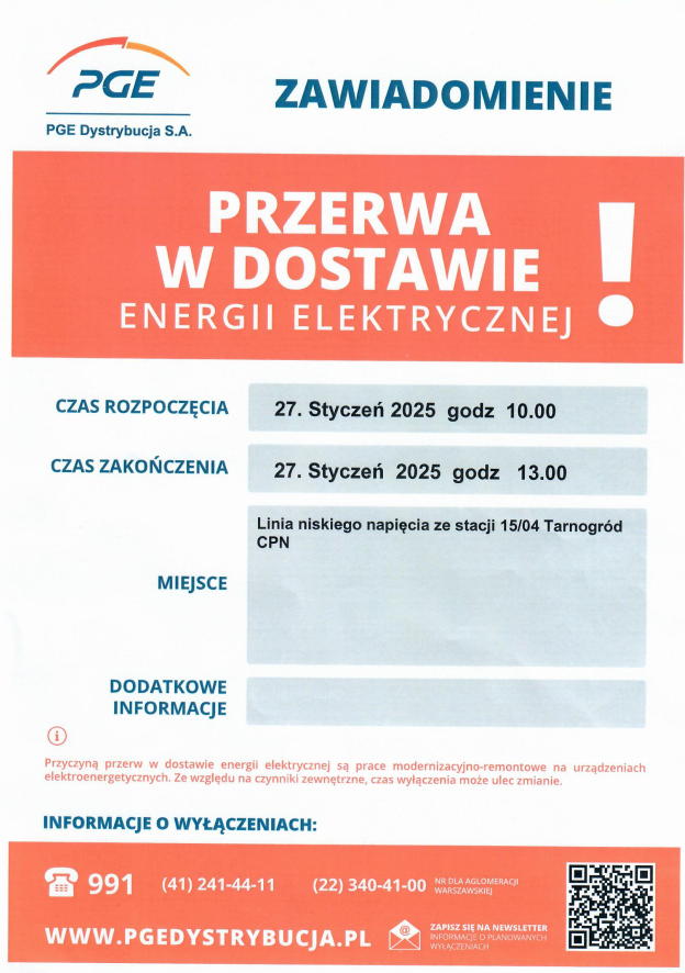 W związku z przerwą w dostawie prądu, informujemy, że w dniu 27.01.2025 r. w godzinach 10-13 kasa będzie nieczynna.